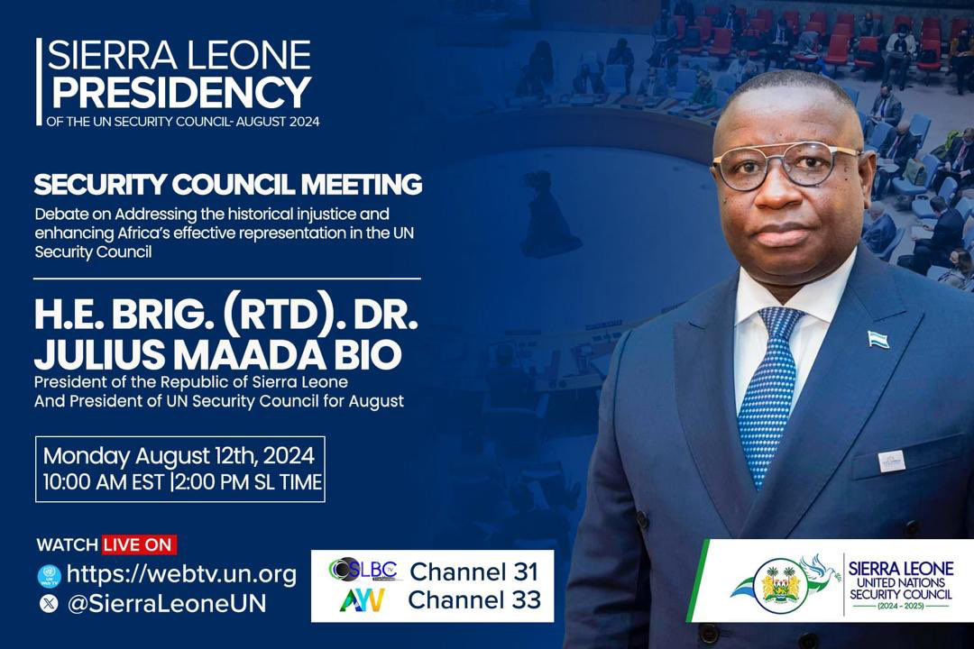 Sierra Leone’s President Julius Maada Bio will on Monday, 12th August 2024 preside over a groundbreaking debate at the United Nations Security Council, where he serves as the current President.