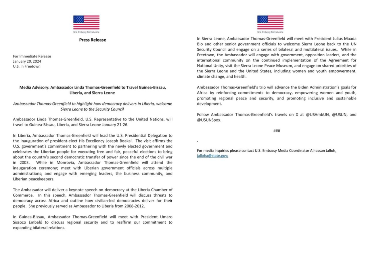 In a press release dated 20th January, 2024, the U.S. Embassy in Freetown, Sierra Leone, has announced the upcoming visit of Ambassador Linda Thomas-Greenfield, the U.S. Representative to the United Nations, as part of her tour to Guinea-Bissau, Liberia, and Sierra Leone from the 21st to the 26th of January 2024.