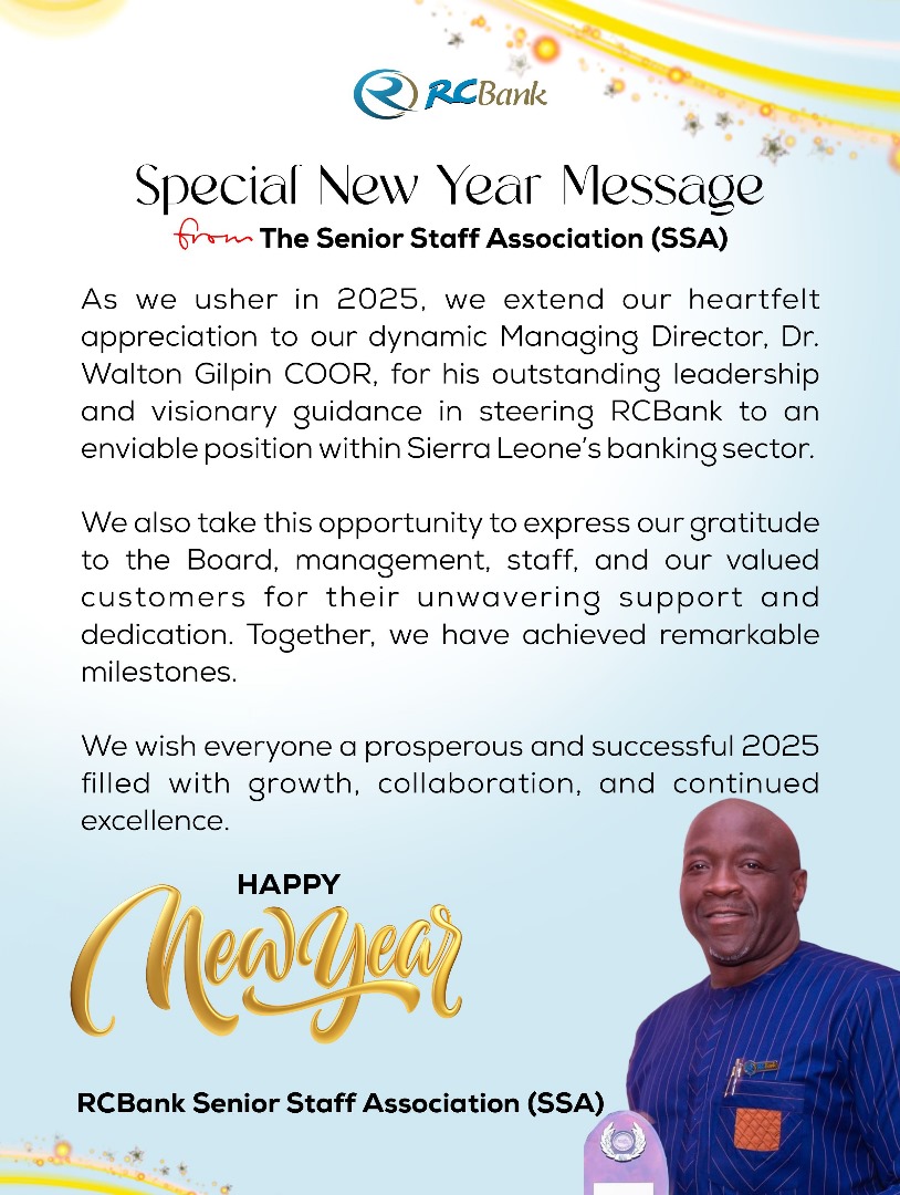 As Sierra Leone ushers in 2025, the Senior Staff Association (SSA) of Rokel Commercial Bank has delivered a heartfelt New Year message, extending appreciation and hope for the year ahead.