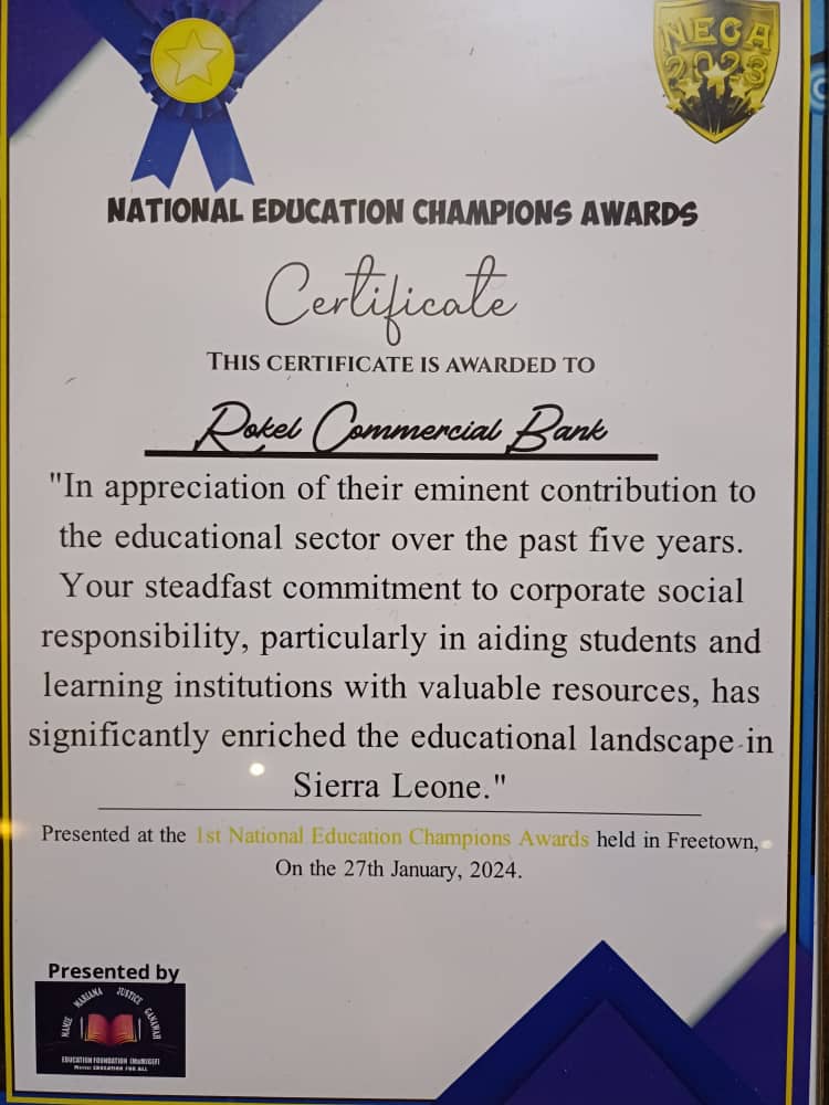 Rokel Commercial Bank, standing as the leading commercial bank in the nation, is swiftly gaining early recognition in 2024 for its substantial contributions to education and the overall development of Sierra Leone.