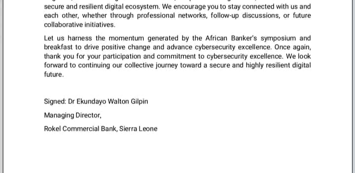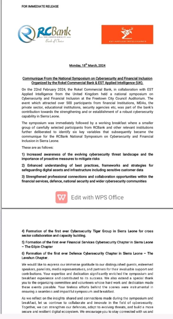One of Sierra Leone’s leading financial institutions, Rokel Commercial Bank has issued a Communiqué from the National Symposium on Cybersecurity and Financial Inclusion Organized by the RCBank and EST Applied Intelligence (UK) On the 22nd February 2024 at the Freetown City Council Auditorium.