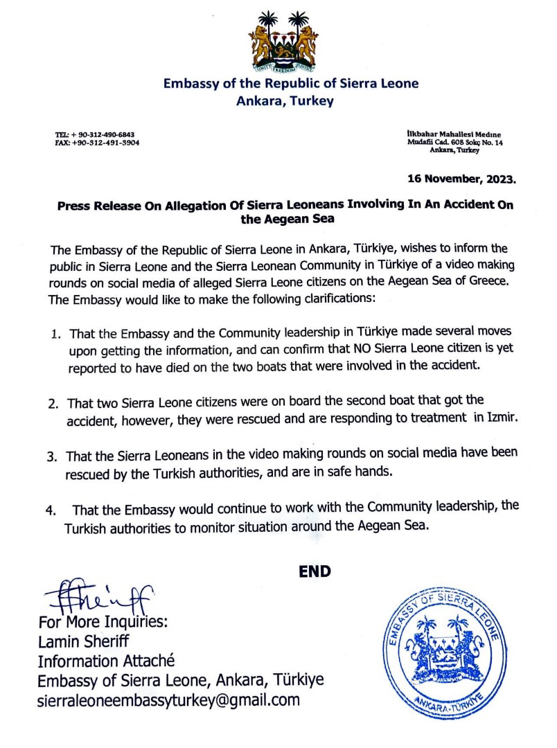 The Embassy of the Republic of Sierra Leone in Ankara, Türkiye, issued a press statement on November 16, 2023, addressing a video circulating on social media depicting alleged Sierra Leone citizens in distress on the Aegean Sea of Greece.