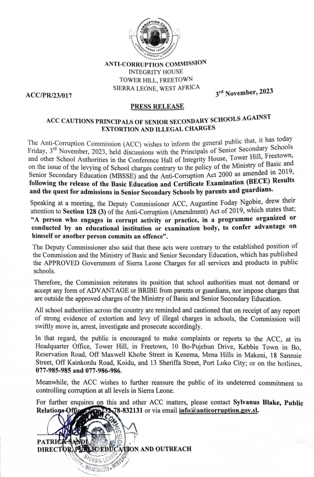 On November 3rd, 2023, the Anti-Corruption Commission (ACC) of Sierra Leone issued a stern caution to Principals of Senior Secondary Schools regarding the alarming issue of extortion and illegal charges through a press release.