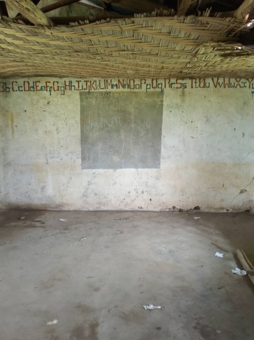 Inside the classrooms, there are no chairs and desks and the whole school compound is covered with grass.