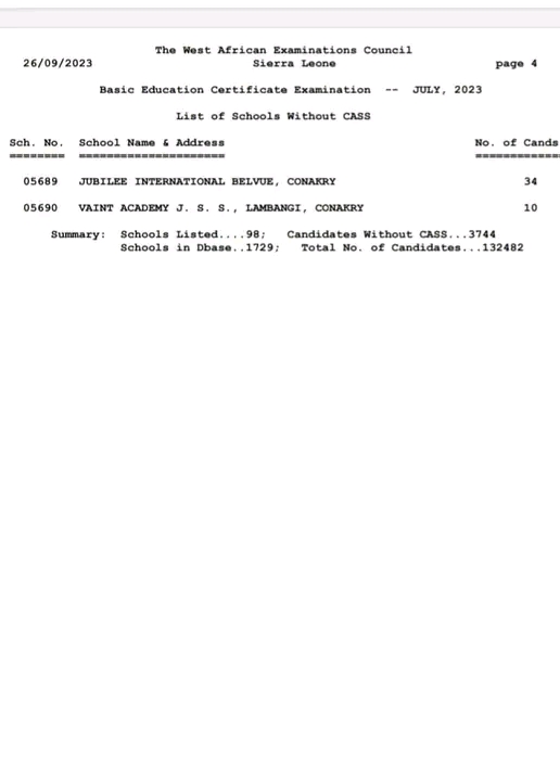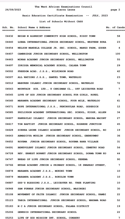 The West African Examination Council Sierra Leone has released a list of schools that took the 2023 July, Basic Education Certification Examination (BECE) without continuous assessment Grades (CASS).