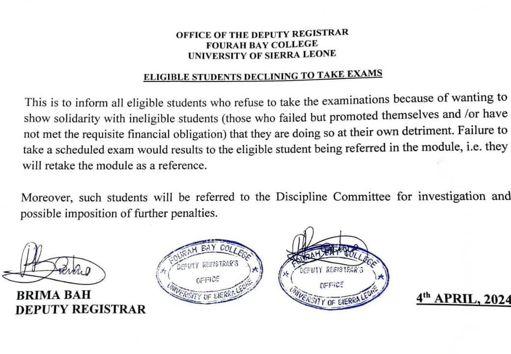 The Office of the Registrar, Fourah Bay College has informed all eligible students who refuse to take the examinations because of wanting to show solidarity with ineligible students (those who failed but promoted themselves and/or have not met the requisite financial obligation) that they are doing so at their own detriment.