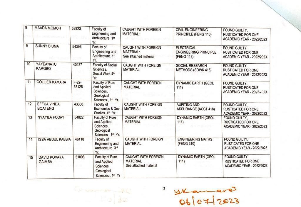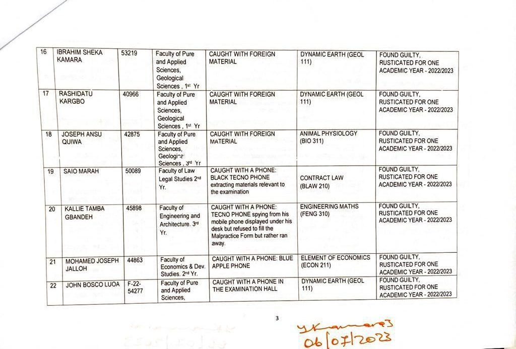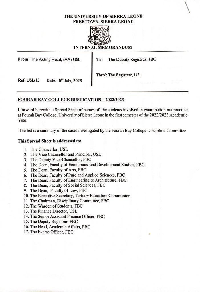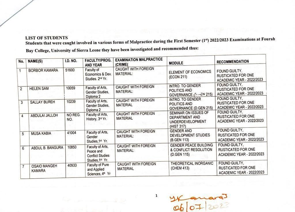 The head of the administration said, “I forward herewith a Spread Sheet of names of the students involved in examination malpractice at Fourah Bay College, University of Sierra Leone in the first semester of the 2022/2023 Academic Year. The list is a summary of the cases investigated by the Fourah Bay College Discipline Committee.”