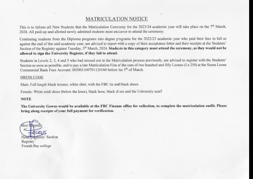 Fourah Bay College (FBC), a prestigious institution under the University of Sierra Leone, is gearing up for its annual Matriculation Ceremony scheduled for March 7, 2024. New students admitted for the 2023/24 academic year are urged to mark their calendars and ensure their presence at this significant event.