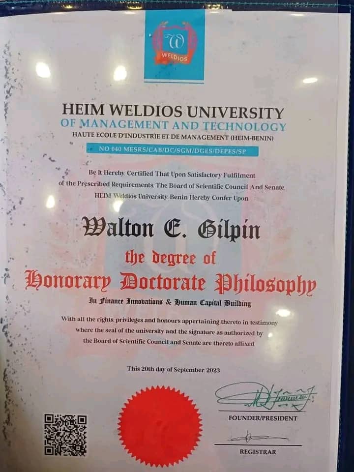 The Management of Weldios University of Management and Technology, has honoured notable African leaders in humanitarian, business, and public service with prestigious Doctorate Degrees, PhD Honoraris Causa, in various fields of endeavor where they have distinguished themselves in collaboration with the President of All Africa Student Union (Mr. Osisiogu Osikenyi E.) and his Leadership Team.