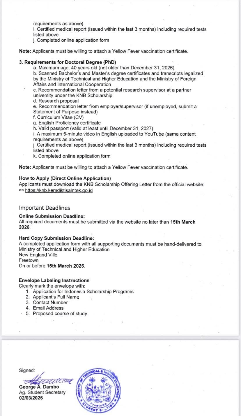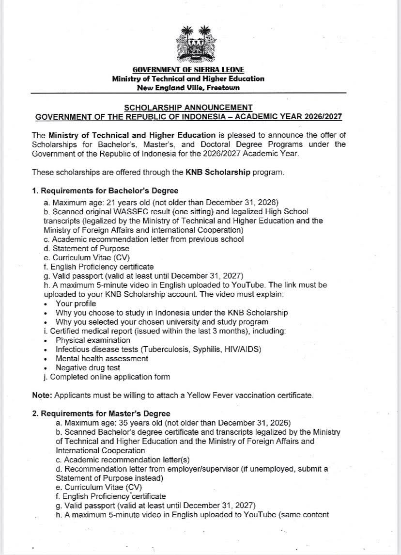 The Ministry of Technical and Higher Education has announced a new wave of international scholarship opportunities for Sierra Leonean students, offered by the Government of the Republic of Indonesia for the 2026/2027 academic year.