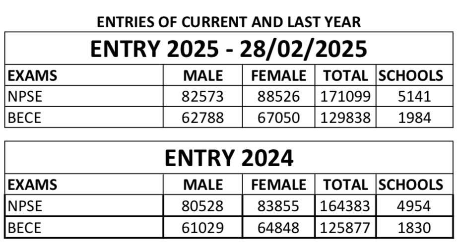 The Ministry of Basic and Senior Secondary Education (MBSSE) has reported a rise in pupil entries for the 2025 National Primary School Examination (NPSE) and the Basic Education Certificate Examination (BECE) compared to the previous year.