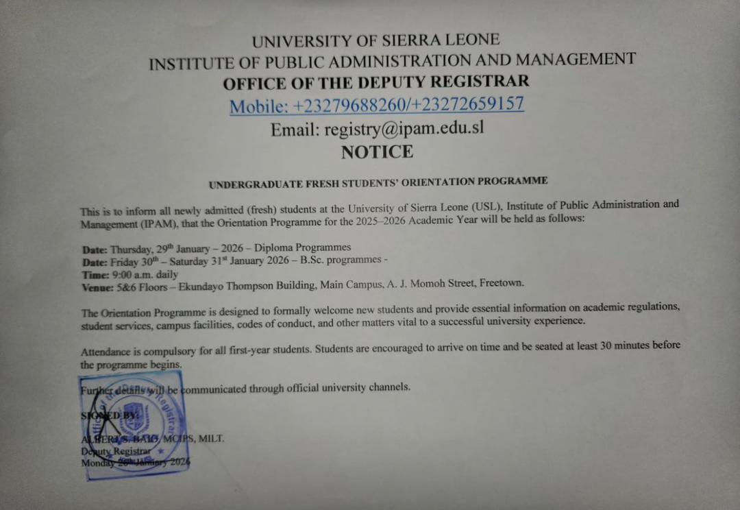 The University of Sierra Leone’s Institute of Public Administration and Management (IPAM) has officially announced its Undergraduate Fresh Students’ Orientation Programme for the 2025–2026 academic year.