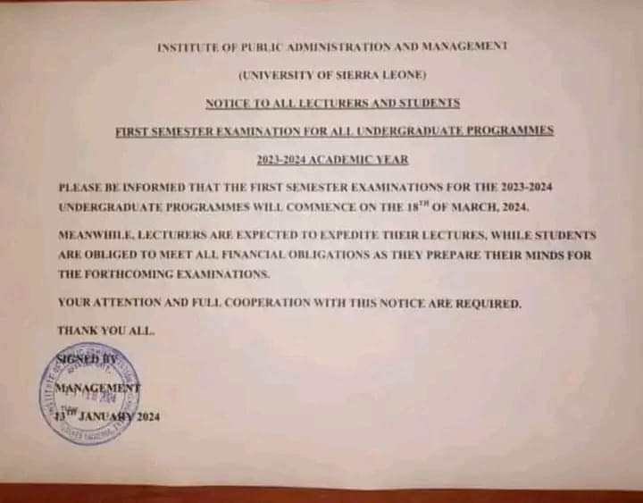 The Institute of Public Administration and Management (University of Sierra Leone) has issued a notice to all lecturers and students informing of the commencement of the first semester examination for all undergraduate programmes for the 2023-2024 academic year.