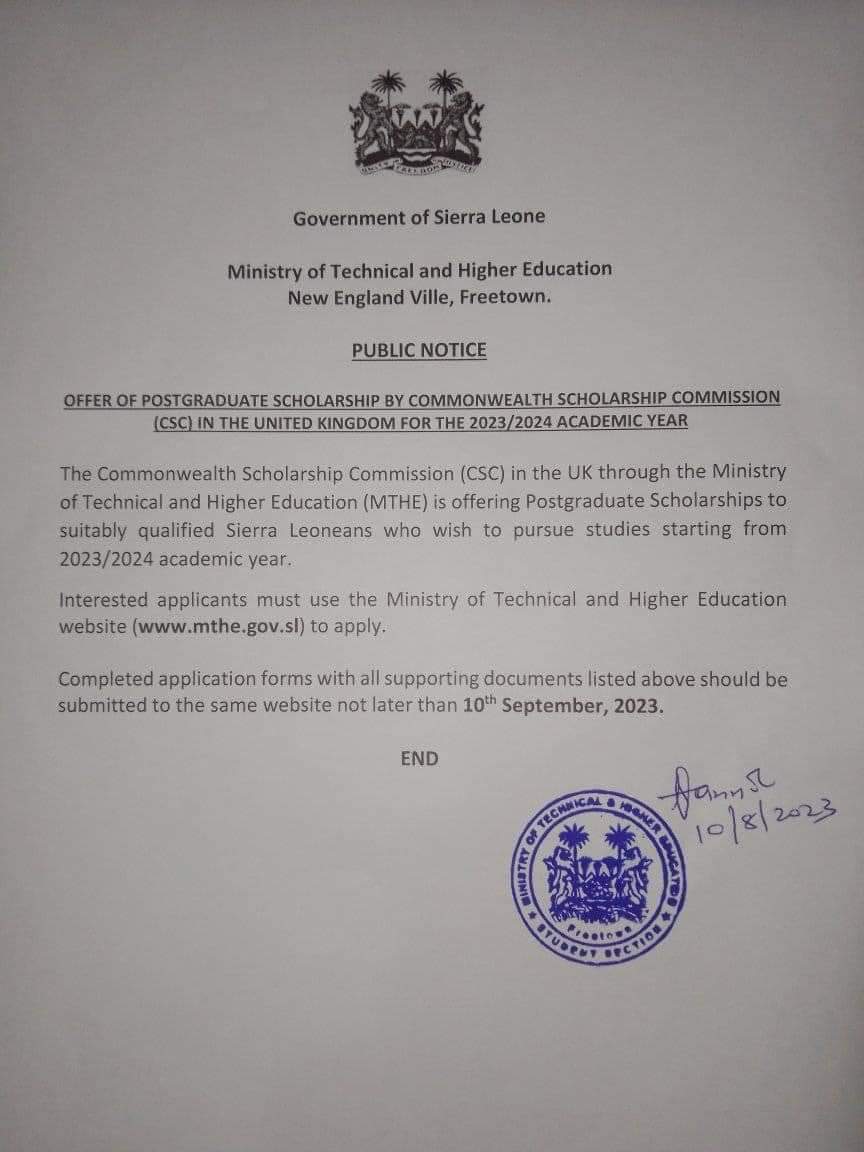 The Ministry of Technical and Higher Education (MTHE) is pleased to announce a remarkable opportunity for Sierra Leonean scholars to enhance their educational pursuits on an international scale.