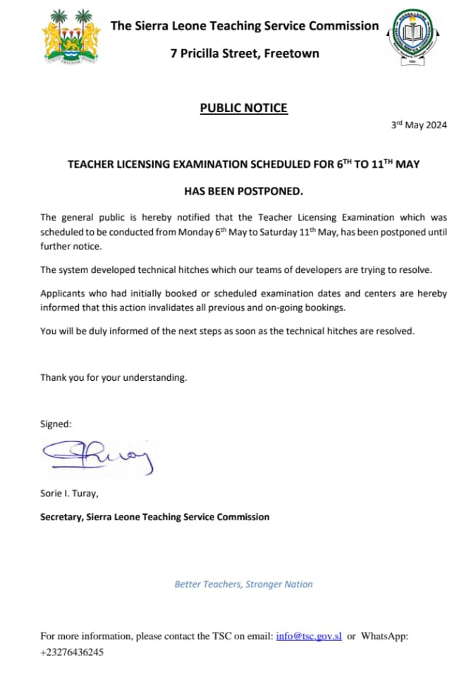 The Sierra Leone Teaching Service Commission has announced the postponement of the Teacher Licensing Examination, originally scheduled to take place from May 6th to May 11th.