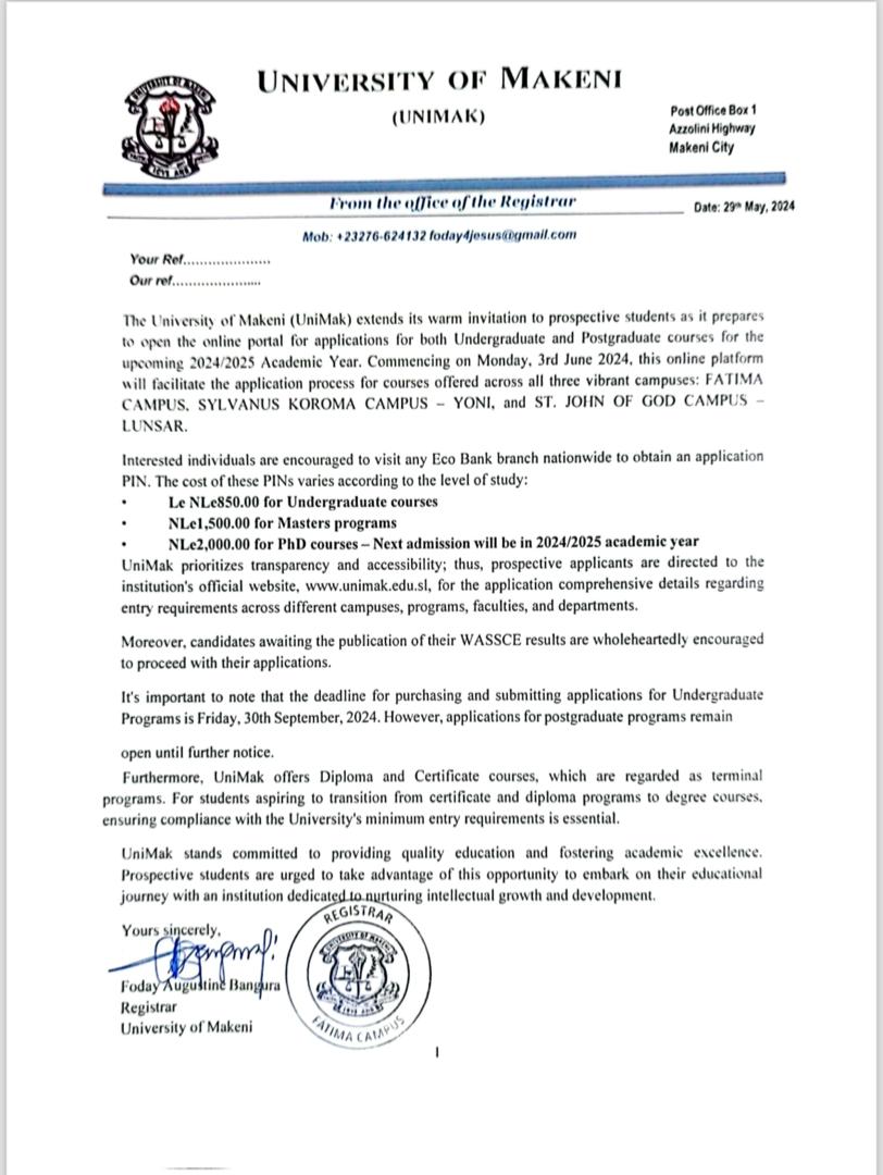 The University of Makeni (Unimak), a private institution in the Northern Province of Sierra Leone, has opened the online portal for applications for both Undergraduate and Postgraduate courses for the 2024/2025 academic year.