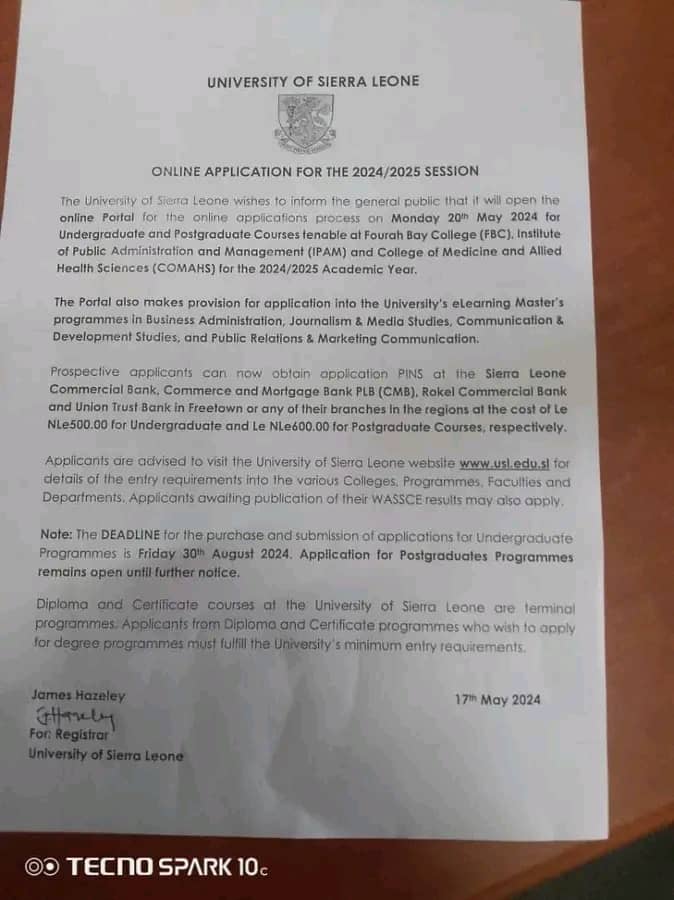 The University of Sierra Leone has informed the general public that it will open the online Portal for the online applications process on Monday 20th May 2024 for Undergraduate and Postgraduate Courses tenable at Fourah Bay College (FBC), Institute of Public Administration and Management (IPAM) and College of Medicine and Allied Health Sciences (COMAHS) for the 2024/2025 Academic Year.