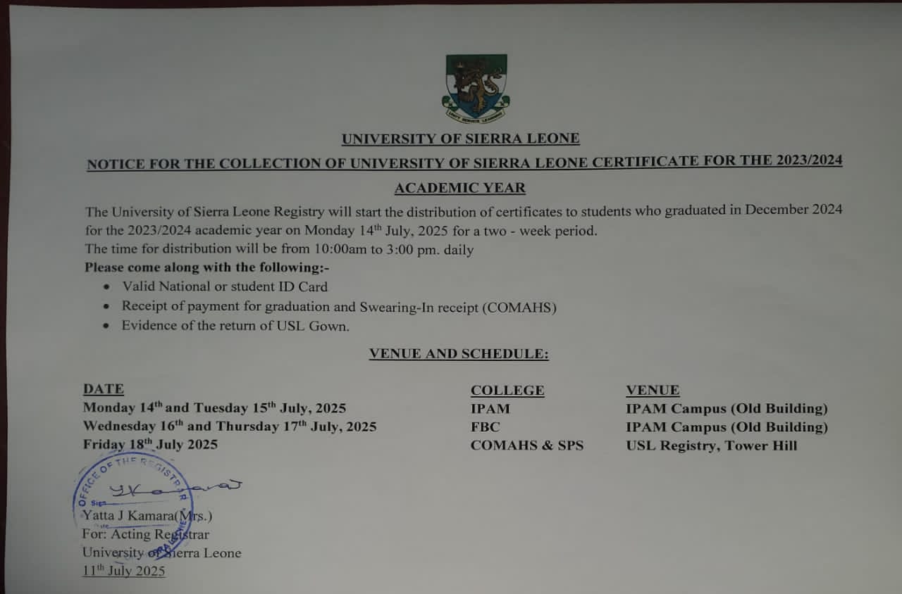 The University of Sierra Leone (USL) has officially announced the schedule for the distribution of certificates to students who graduated in December 2024 for the 2023/2024 academic year.