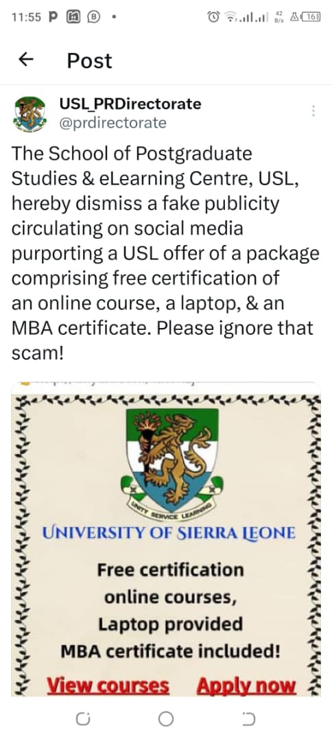 The school of Post graduate studies and eLearning Center, University of Sierra Leone has advised the public to ignore a fake online publicity circulating on Social Media Purporting USL to offer of a Package comprising free certification of an online course, a laptop, and an MBA certificate.