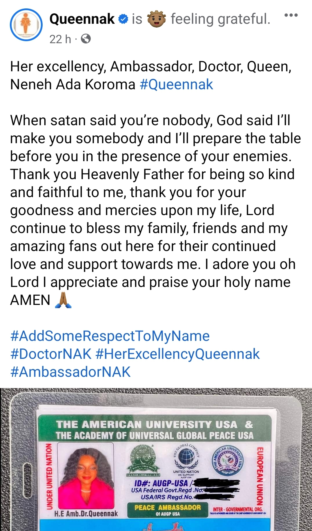 In her Facebook post, Queennak referred to herself as Her Excellency, Ambassador, Doctor, Queen, Neneh Ada Koroma and shared a powerful message of overcoming adversity. She wrote, “When Satan said you’re nobody, God said I’ll make you somebody and I’ll prepare the table before you in the presence of your enemies.”