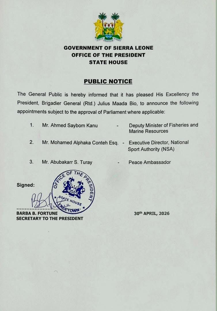 According to an official press release, the appointment was made by President Julius Maada Bio, replacing popular hip-hop artist Alhaji Amadu Bah (Boss La), who previously held the role.