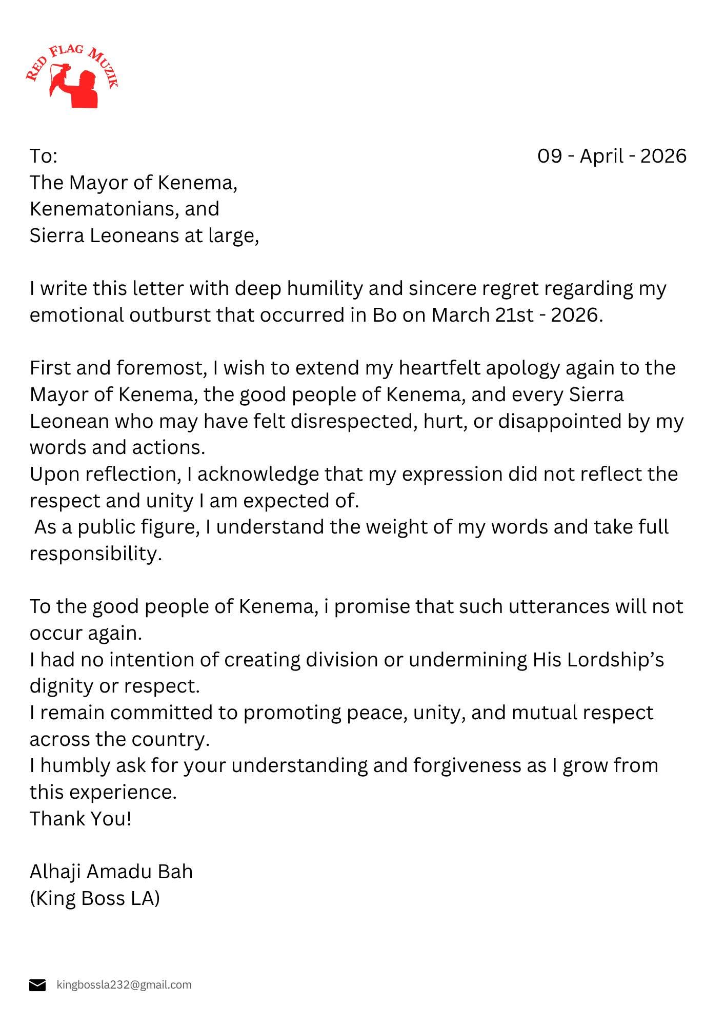 Popular Sierra Leonean musician and peace Ambassador Alhaji Amadu Bah, popularly known as King Boss LA, has publicly apologized for his emotional outburst in Bo on March 21, 2026.