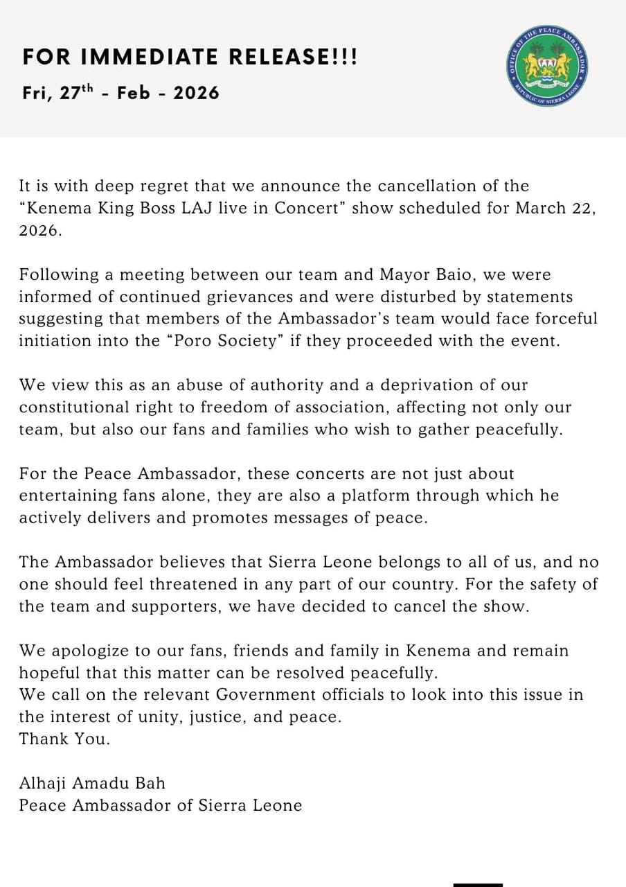 The Peace Ambassador of Sierra Leone, Alhaji Amadu Bah, popularly known as LAJ, has announced the cancellation of his upcoming “Kenema King Boss LAJ Live in Concert,” which was scheduled to take place on March 22, 2026, in Kenema.