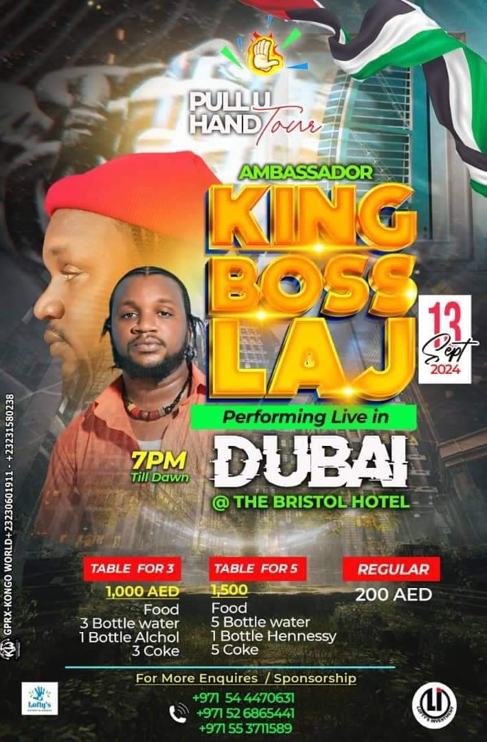 Sierra Leone Peace Ambassador and hip-hop artist Alhija Amadu Bah popularly known as Boss La is set to organize a show in Dubai titled “Pull U Hand Tour”.