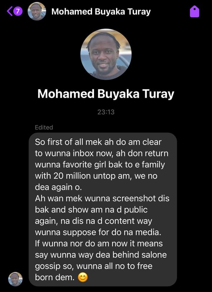 The news surfaced on social media, with Salone Gossip, a popular Sierra Leonean blog page, sharing a screenshot message from Mohamed Buya Turay confirming the end of his marriage.