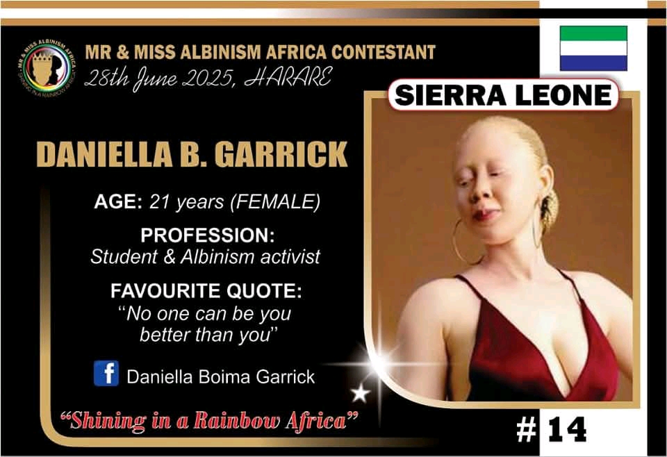 The pageant is scheduled for June 23–28, 2025, and is part of the wider African Diversity Festival. Daniella, who graduated with a Diploma in Air Travel Management, is passionate about supporting the rights and welfare of persons with albinism, as well as women and girls with disabilities in Sierra Leone.