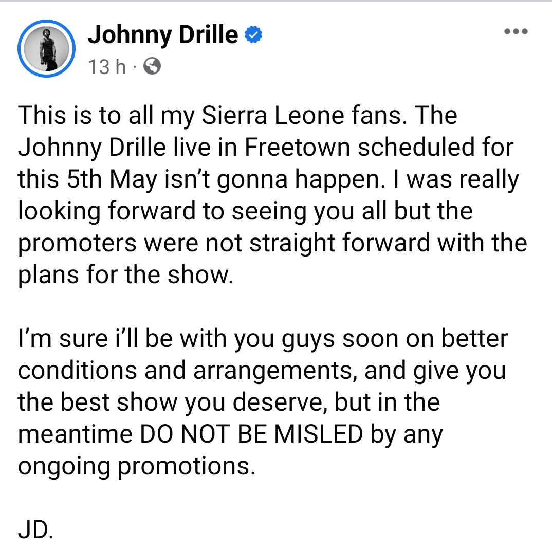 Talented Nigerian singer and songwriter currently signed to Mavins Records, Johnny Drille has informed his Sierra Leonean fans that his scheduled live show in Freetown on May 5th has been canceled.