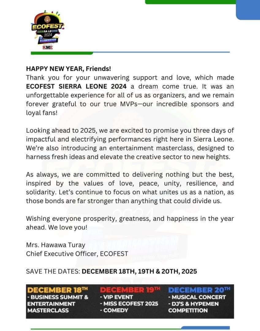 ECOFEST Sierra Leone has released date for its 2025 events which normally happens in December and will be hosted in Sierra Leone.