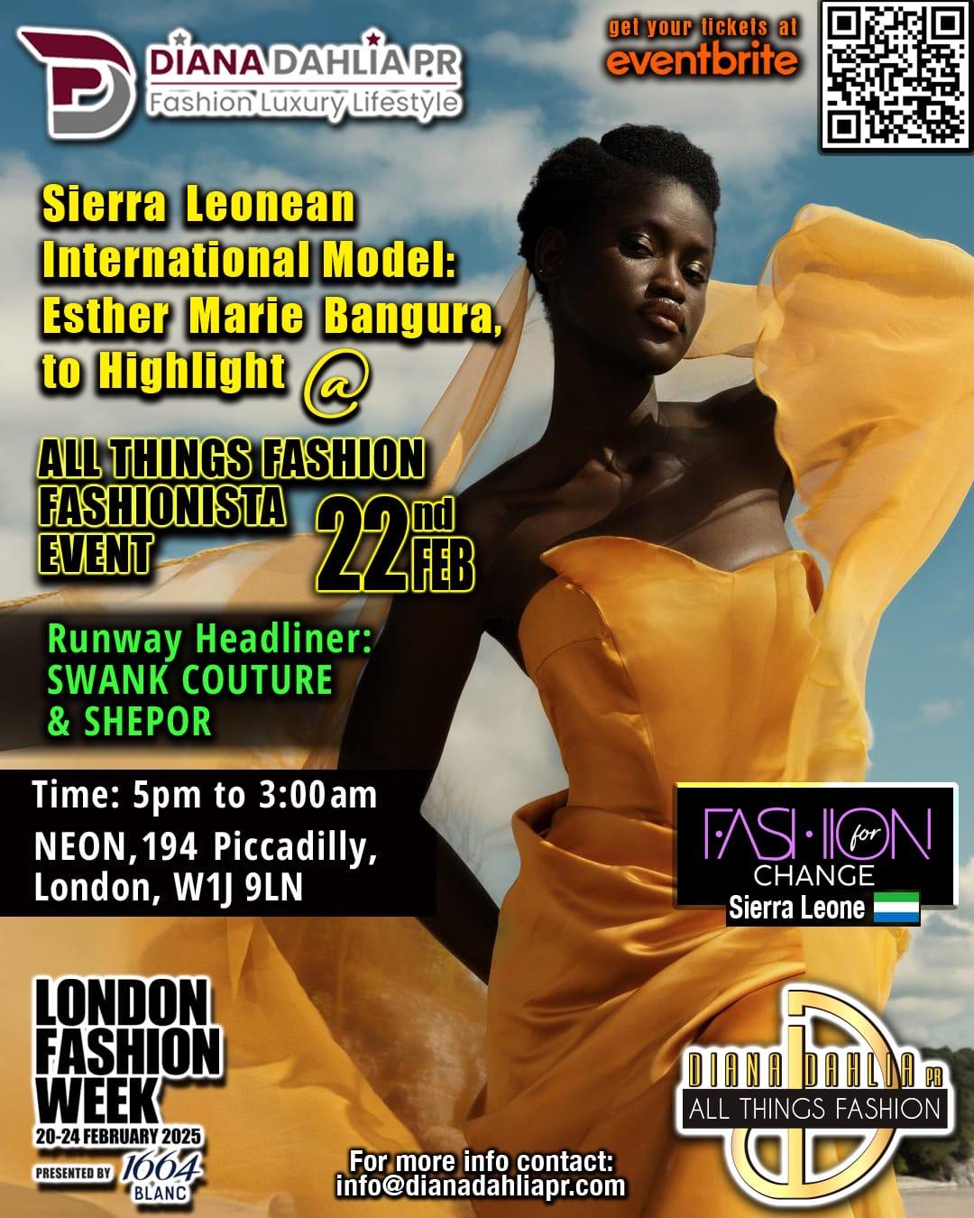 Sierra Leonean beauty and fashion icon Esther Marie Bangura, widely known for her remarkable journey in the pageant world, is set to participate at an event at the prestigious London Fashion Week 2025.