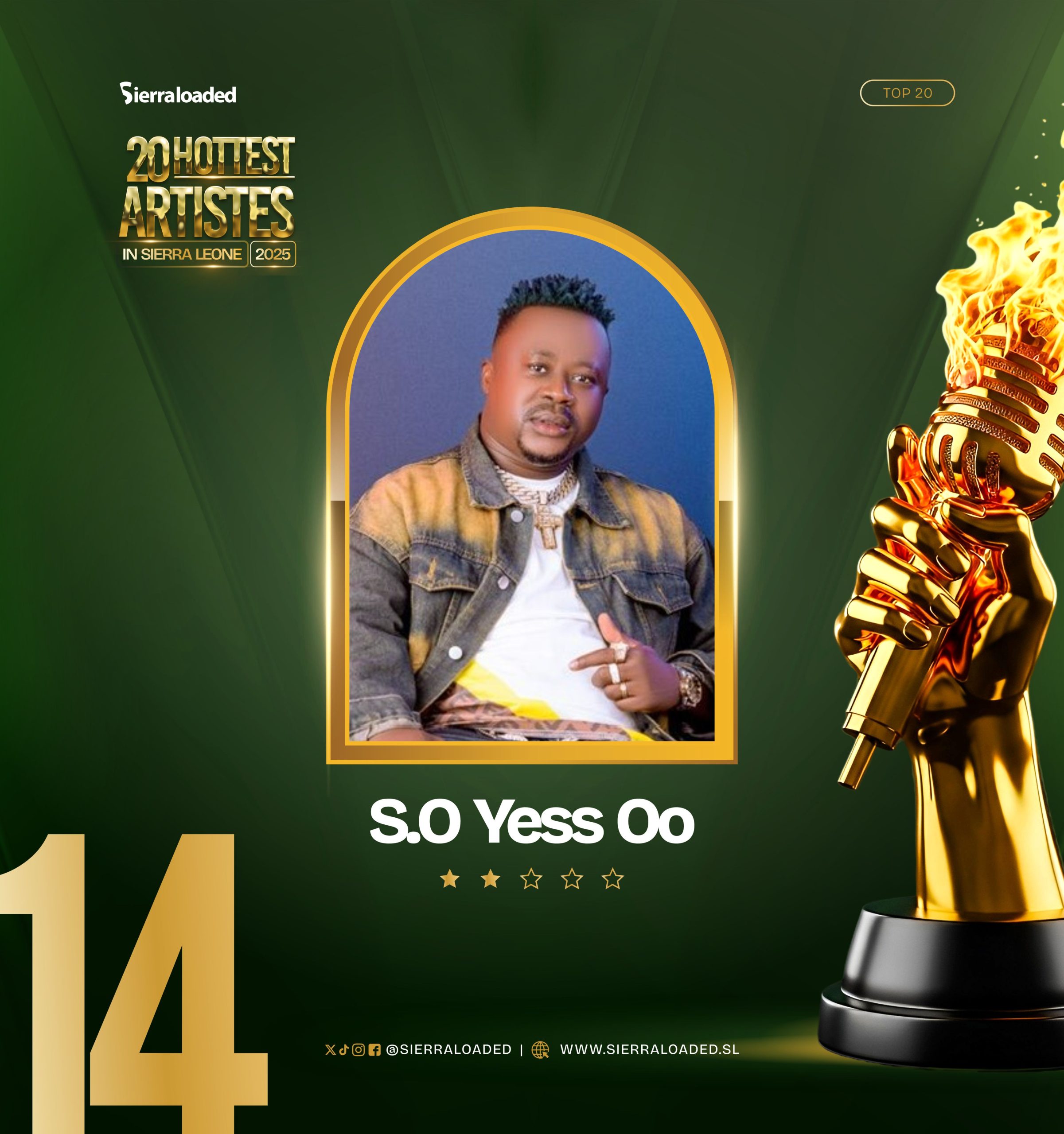 For crafting a streetwise anthem that celebrates our heroes, blending tradition with the new wave, and delivering one of the most infectious hooks of the year, S.O Yess Oo is the 14th Hottest Artiste in Sierra Leone 2025.