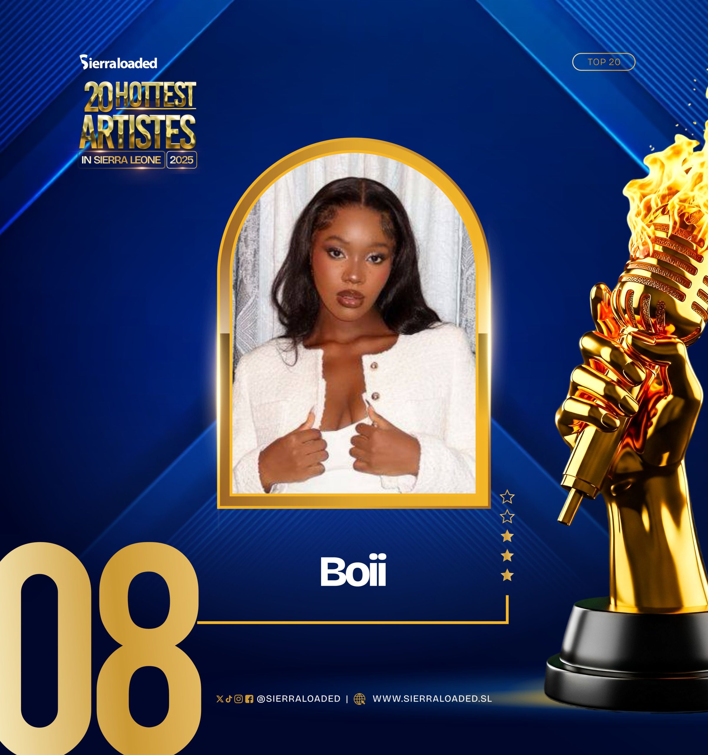 For delivering a flawless EP, creating viral moments, and representing the new generation of female excellence on international levels, Boii is the 8th Hottest Artiste in Sierra Leone 2025.