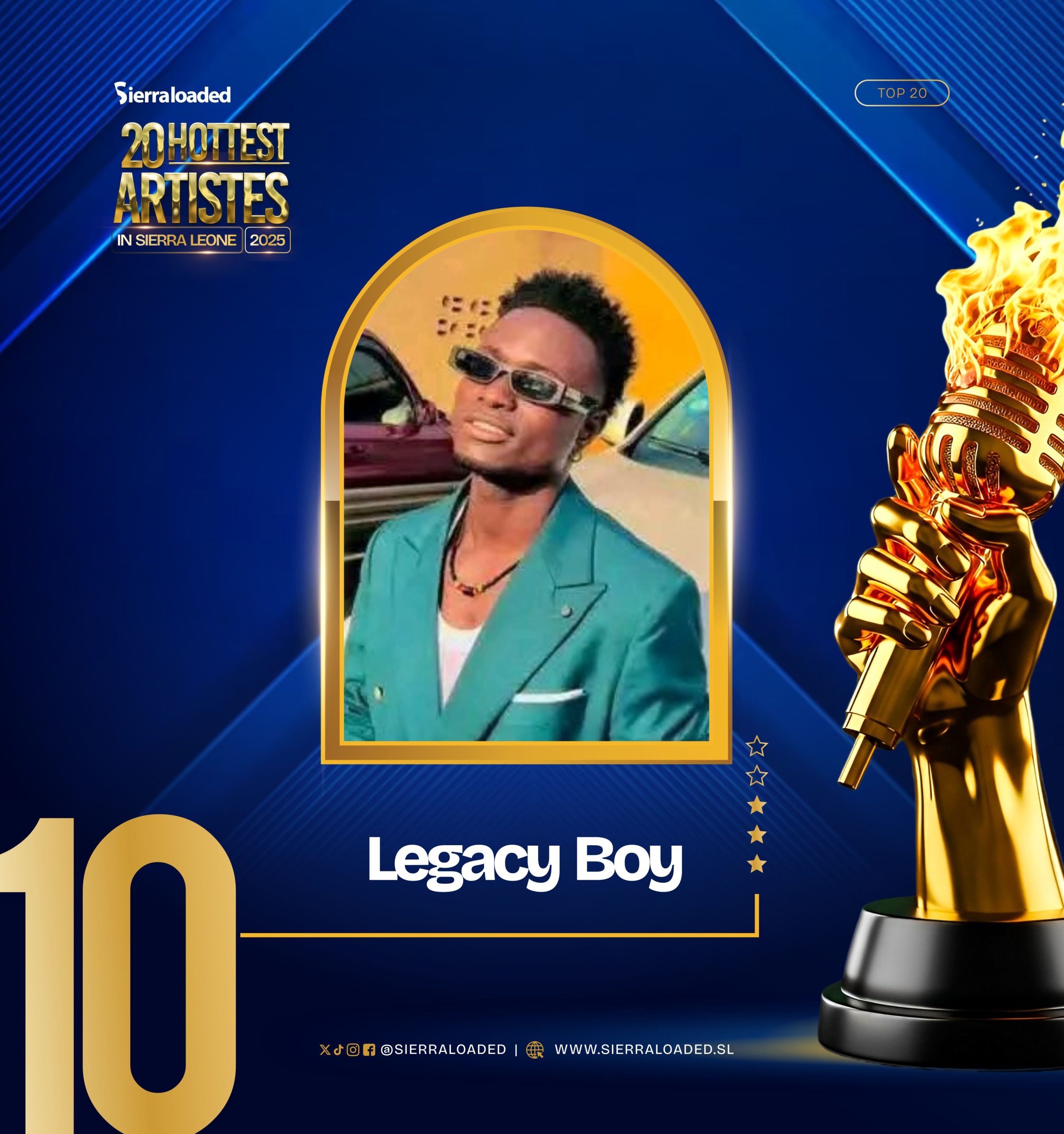 For rising from the streets of Waterloo to performing with the First Lady in under three months, and for delivering the viral anthem that defined the end of the year, Legacy Boi is the 10th Hottest Artiste in Sierra Leone 2025.