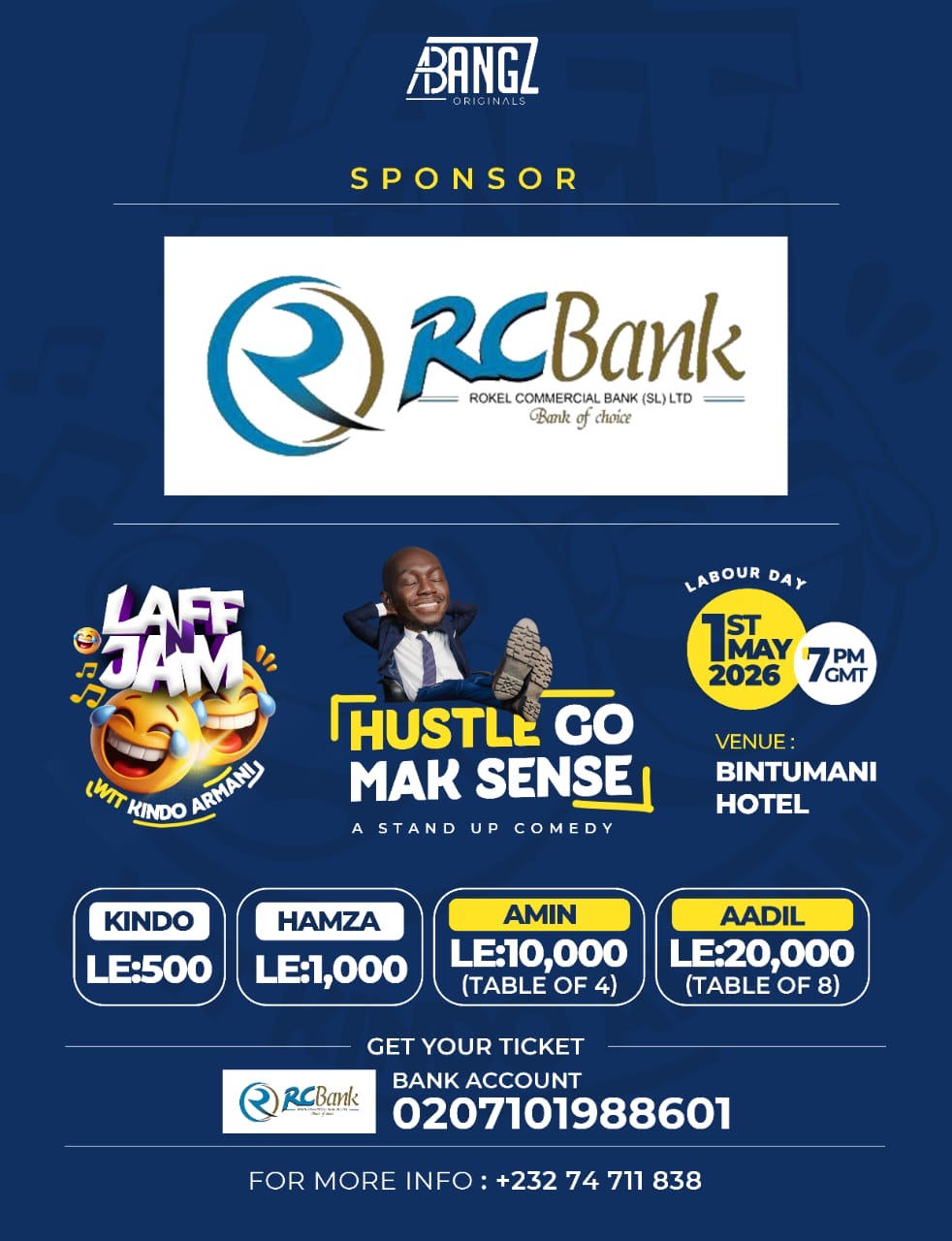 Tickets for the event are now on sale with different categories. Regular tickets under the “Kindo” category cost Le500, while “Hamza” tickets are priced at Le1,000. VIP access under the “Amin” category is Le10,000, and the top “Aadil” package goes for Le20,000. For bookings and inquiries, fans can contact +23274711838.