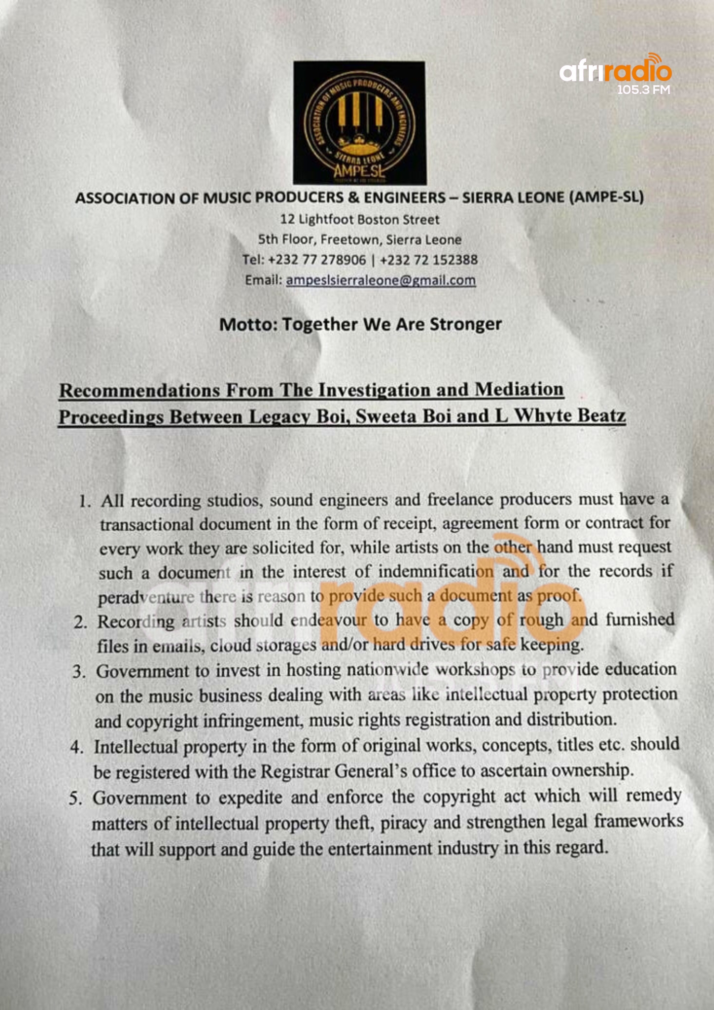 The Association of Music Producers & Engineers – Sierra Leone (AMPE-SL) has released a crucial set of recommendations aimed at preventing future copyright and ownership disputes within the country’s entertainment industry.