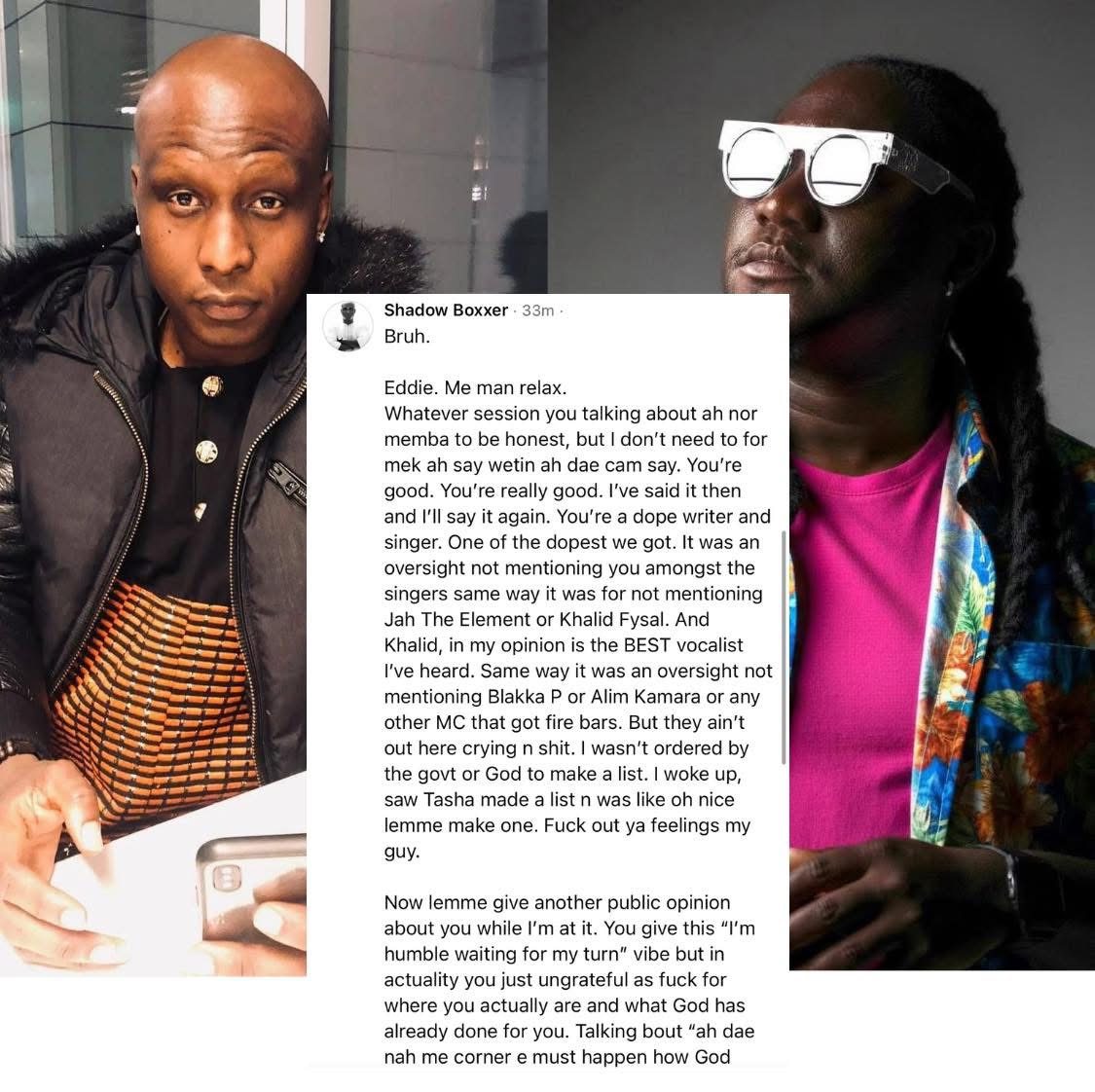 In a public statement circulating on social media, Shadow Boxxer addressed Kontri Boss – whom he referred to as “Eddie” – and made it clear that there was no personal dispute between them. He explained that he could not remember the specific studio session Kontri Boss referred to in his interview but said that did not change his long-held respect for the singer’s talent.