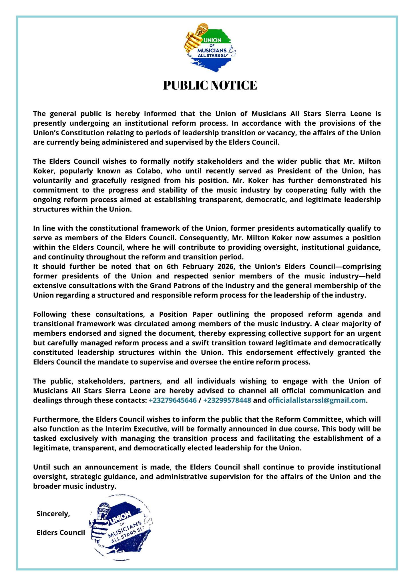 The Elders Council advised that all official communication and dealings with the Union should be directed to +23279645646, +23299578448, or [email protected].