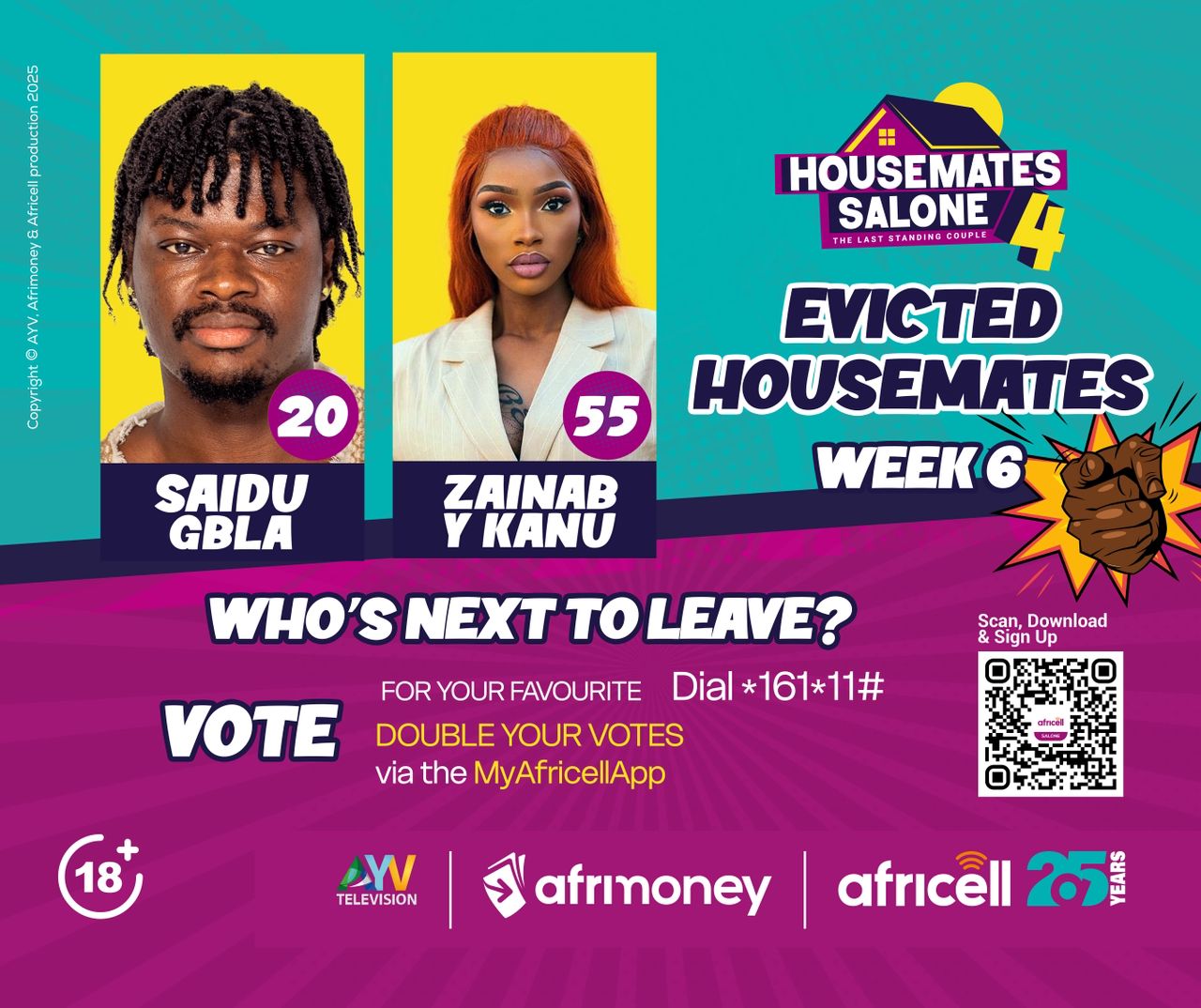 Whoโs next to leave? Keep your favourite Housemate safe by voting via our #MyAfricellApp https://www.africell.sl/download-app/ ๐ using Afrimoney to DOUBLE your votes, or dial *161*11# ๐ฒ๐.