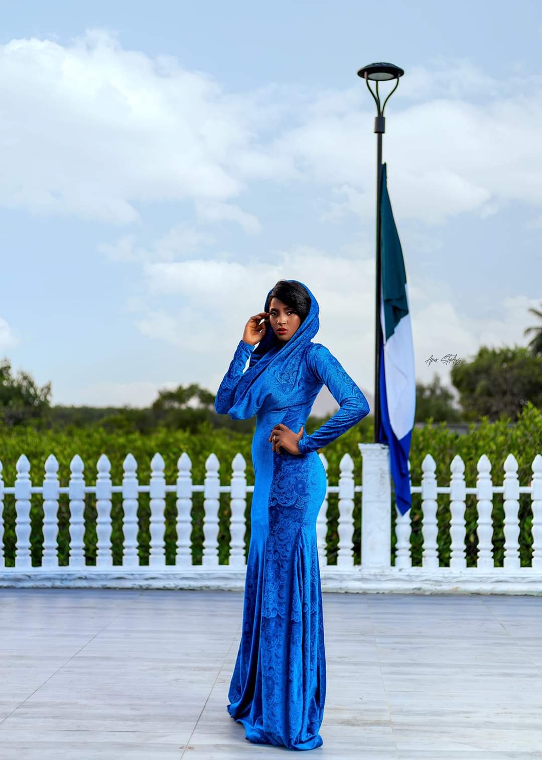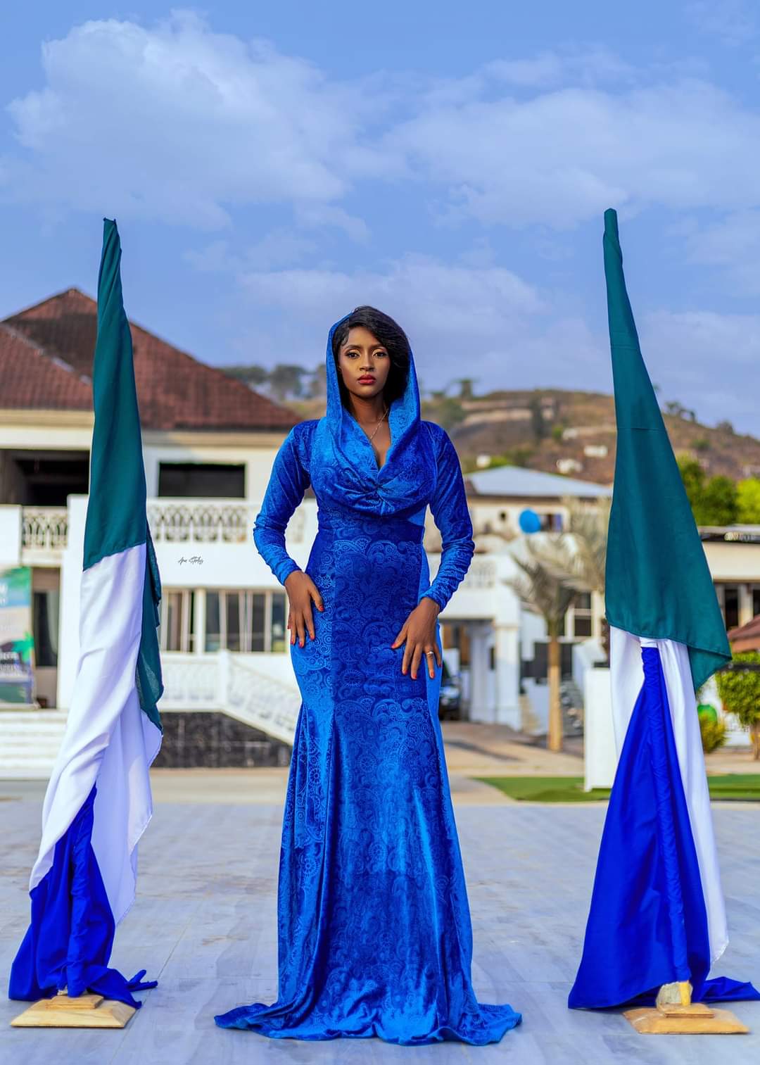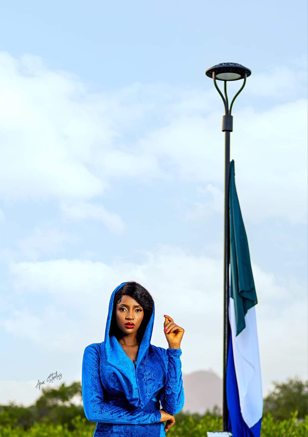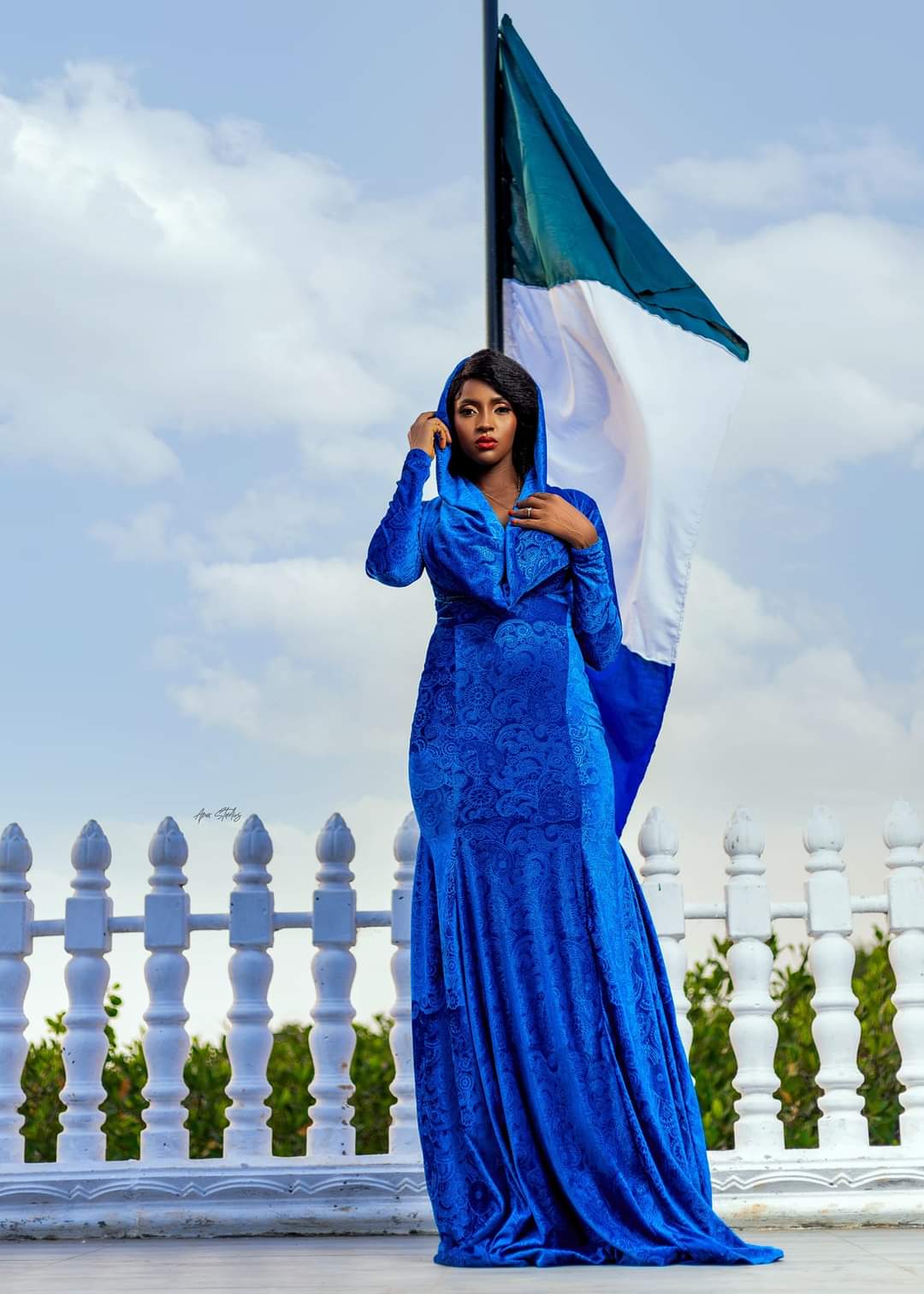 Zainab captured on a beautiful blue dress, standing between the Sierra National Flag as a way of showing love for her country and celebrating independence day as she wishes Happy Independence Day to Sierra Leoneans.