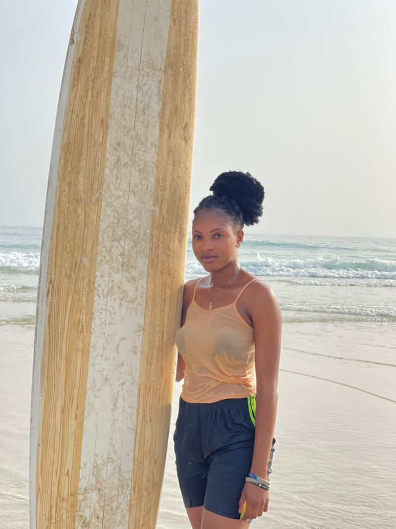 Juju Jeks is a National Youth Service Corp (NYSC). She abandoned comfort zones to join the NYSC, and spent weeks in a training camp. She has been certified by the Government of Sierra Leone’s youth programme as a National Youth Service Corp, recognising her as a Youth Ambassador. Juju Jeks has also joined the Wave Alliance in Sierra Leone– an alliance of community organisations that is providing safe spaces, caring mentors, and a provision of weekly Surf Therapy sessions. The programme gives young people skills to cope with stress, regulate behaviour, build healing relationships, and make positive life choices.