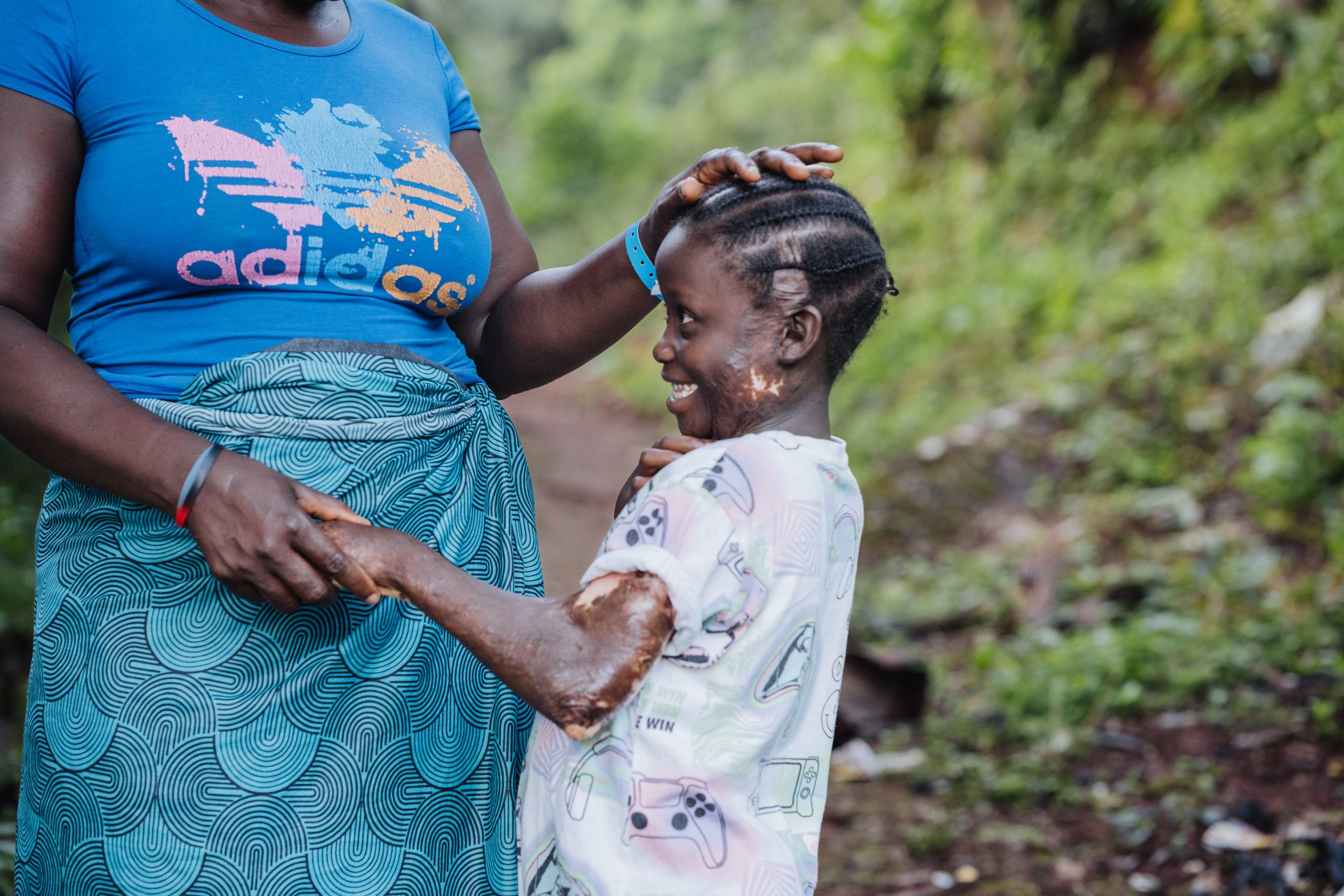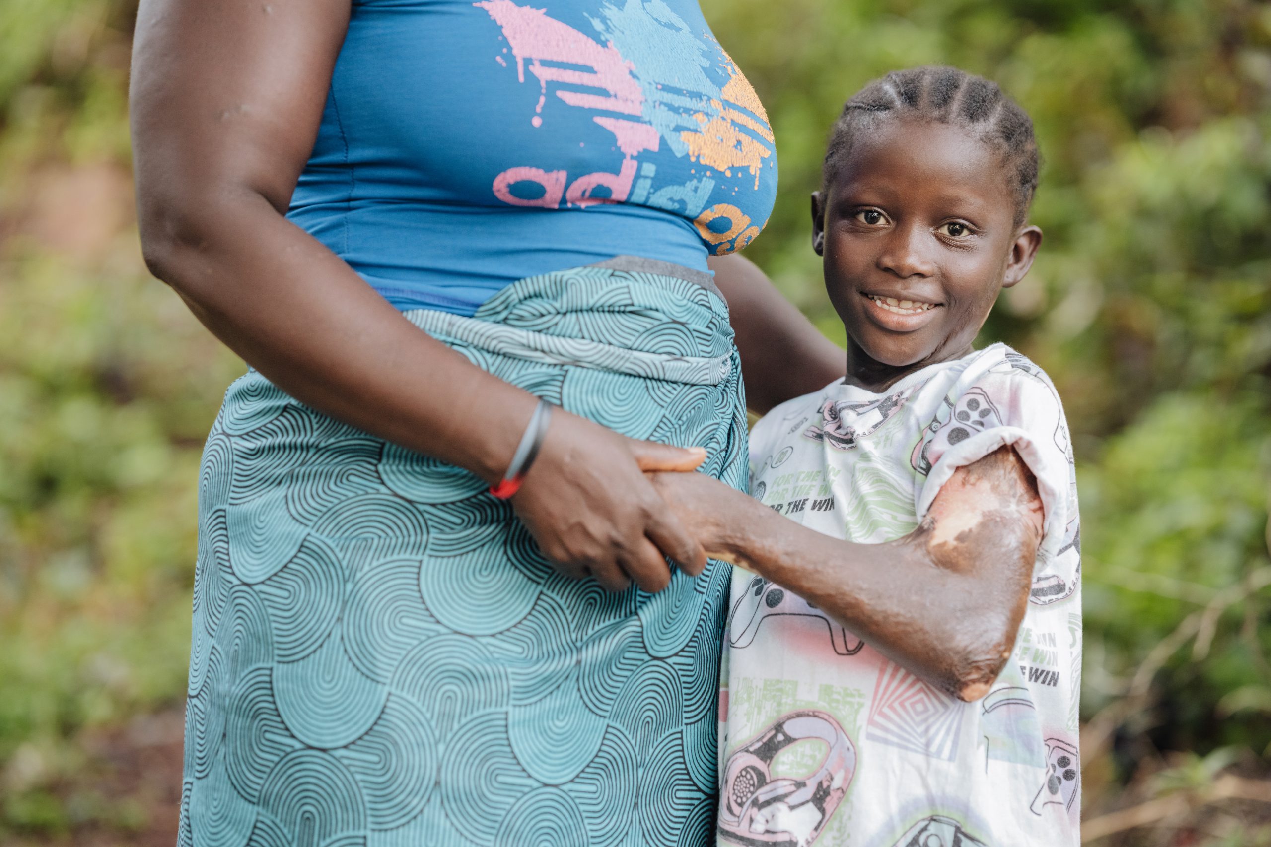 Musu, plastics patient, with her mom during a home visit.