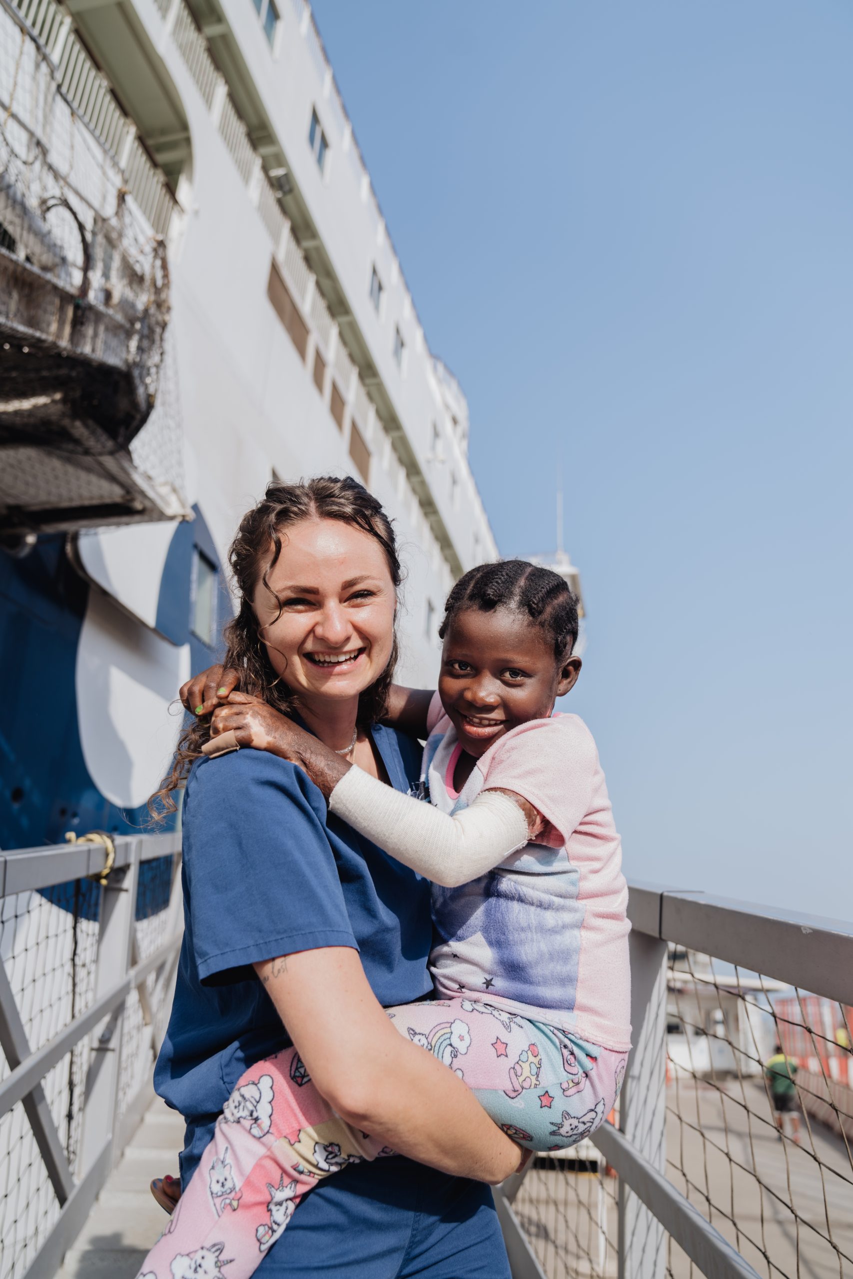 Eight-year-old Musu walked up the gangway of the Global Mercy™ with hope in her heart and a folded left arm – the result of a severe burn scar contracture that had tightened her skin and bent her little finger. Burn contractures like Musu’s are a serious complication, where scar tissue thickens and tightens over time, resulting in functional limitations.