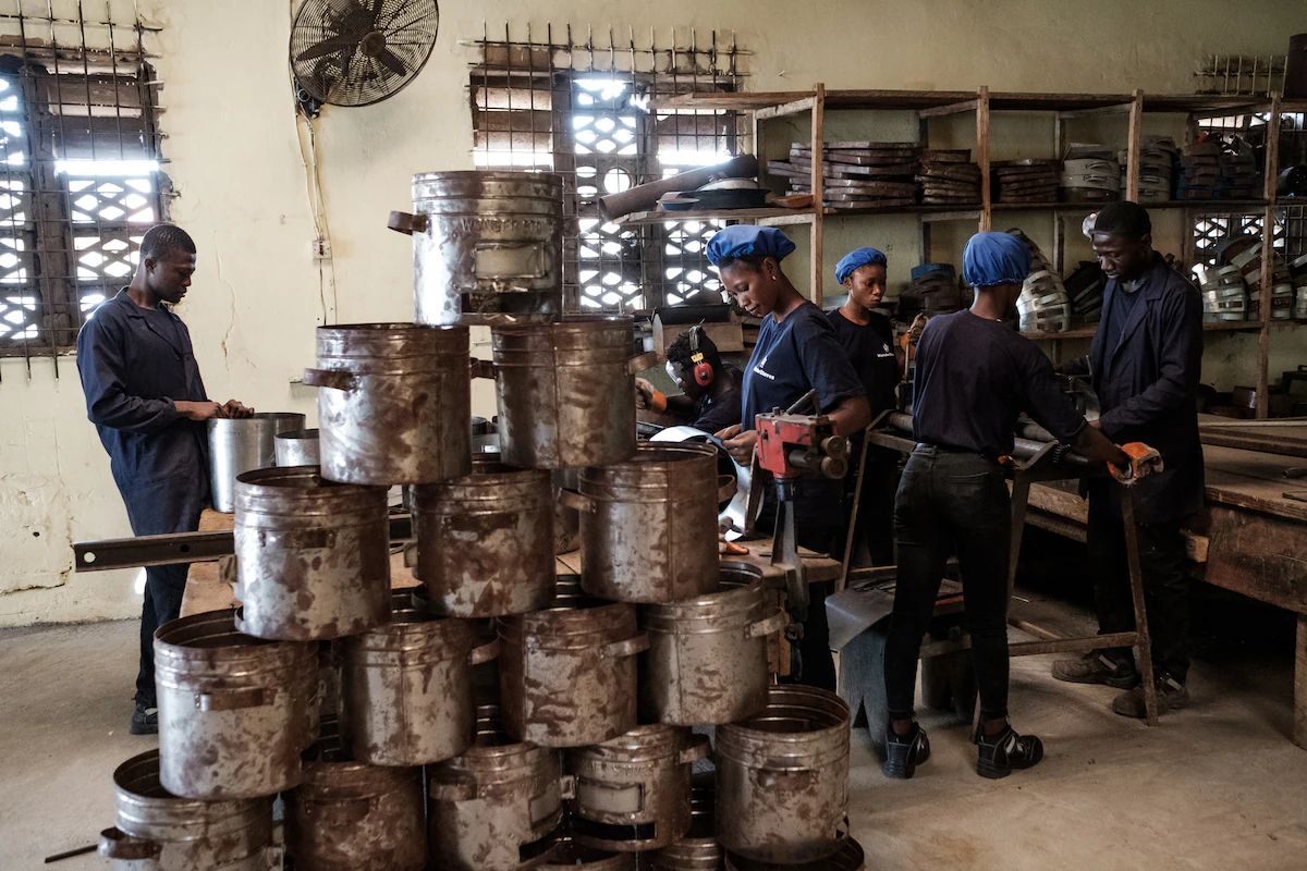 They supply private companies, such as Teranga and Women in Energy Sierra Leone, as well as artisanal stove makers, who fashion versions of the clay-lined charcoal appliances out of scrap metal and sell them for much lower prices. One stove maker said he sells his products in Freetown for 25 leones, or about a dollar.