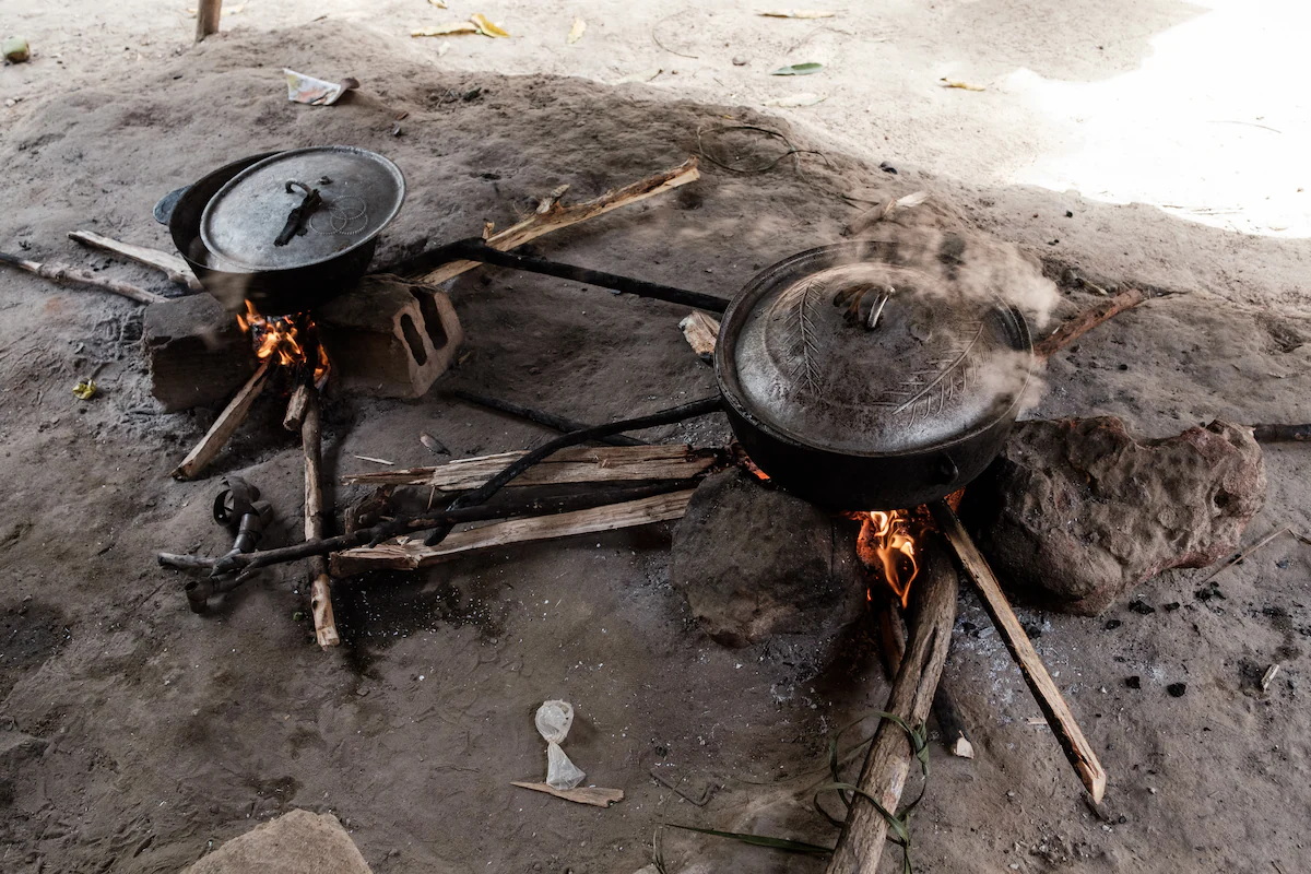 On an unshaded patch of dirt, she prepared food in a scorched black pot that sat several inches off the ground on top of three large stones darkened by soot. Charred branches shoved between the rocks jutted out in every direction.
