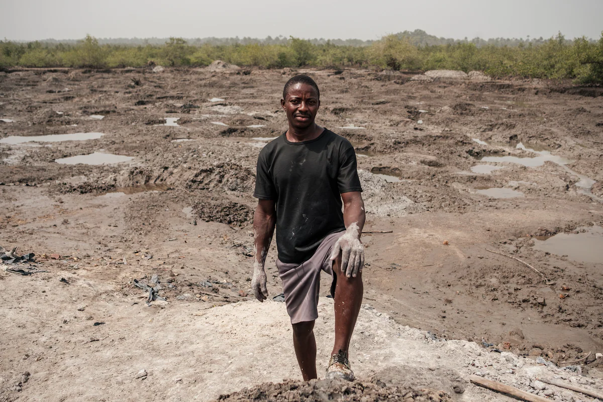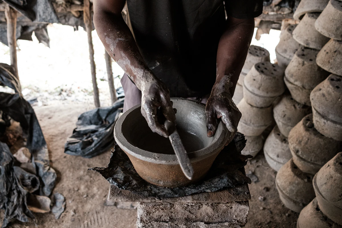 Under the shade of a weathered black tarp held up by branches, Tamba Johnson, 42, placed a thick slab of gray clay into a worn metal mold. He shaped the clay with deft movements, smoothing it with pottery tools fished out of a plastic container half full of murky water. Minutes later, he gingerly removed the metal casing to reveal a familiar shape: a flat-bottomed round basin.