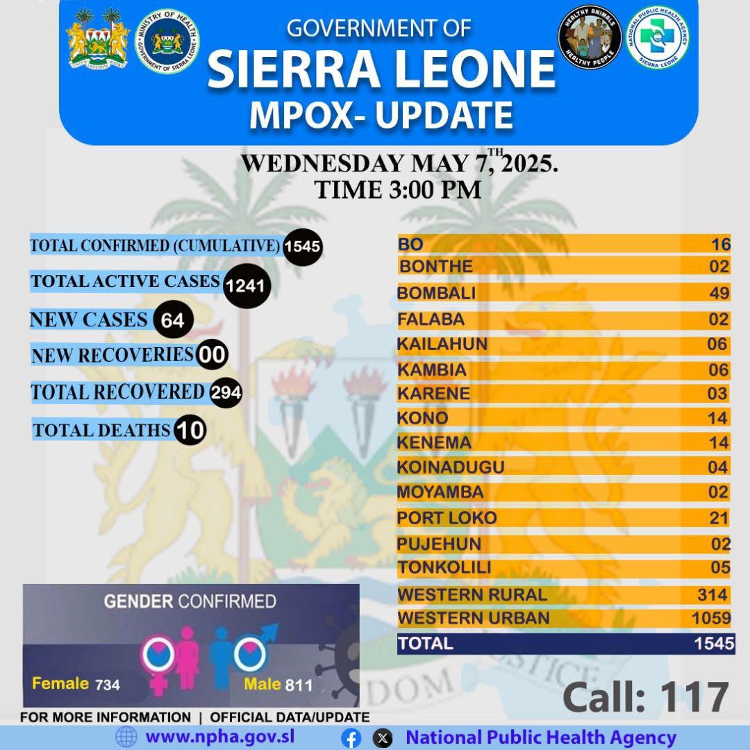 The official report further confirmed that all the districts across the country has recorded case/s of Mpox, with Bo City currently house a total number of Sixteen (16) confirmed cases, and an increase of Forty Nine (49) cases in Bombali. Fourteen (14) cases in Kanema, Two (2) in Moyamba, Twenty One (21) in Port Loko, Five (5) in Tonkolili, with an increase of Six (6) in Kambia, and Three (3) in Karene, Two (2) in Pujehun, and Fourteen (14) in Kono District.