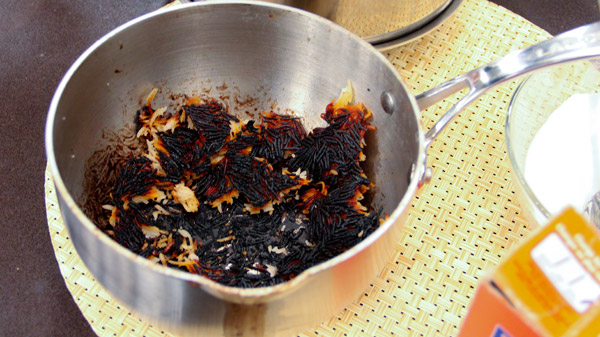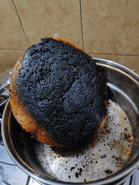 Blackened or Charred Appearance: Burnt food often has a dark, charred appearance.